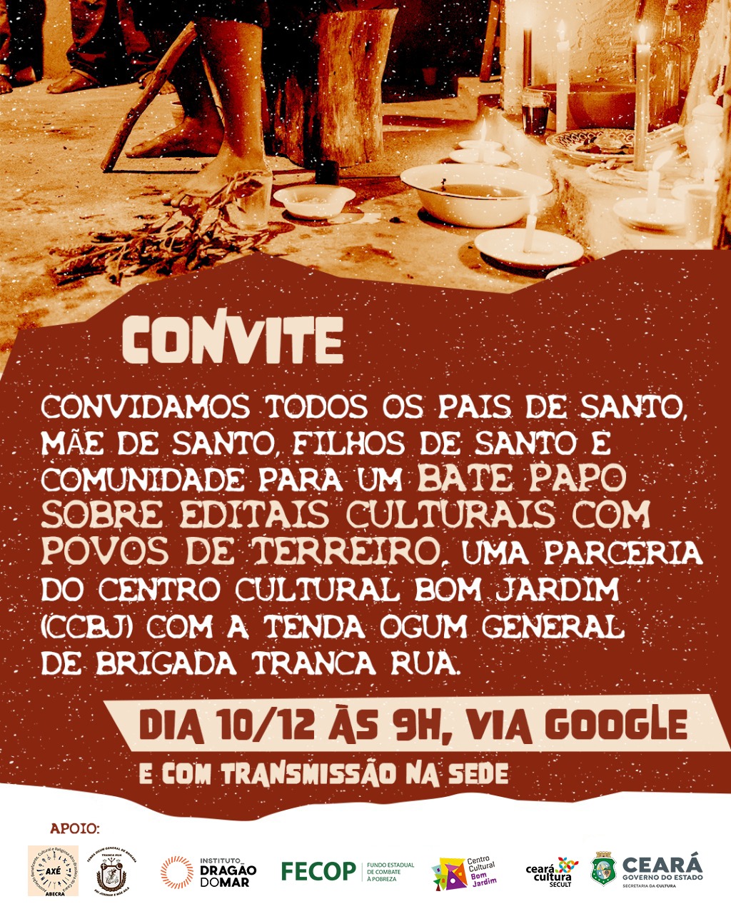 Uma parceria dos Pontos de Cultura Tenda de Ogum General de Brigada e Tranca Rua e Associação Beneficente Cultural e Religiosa Afro-Brasileira do Ceará. é Ponto cultura grupo cultural de batuque de terreiro umbandaé de Boa Viagem-CE