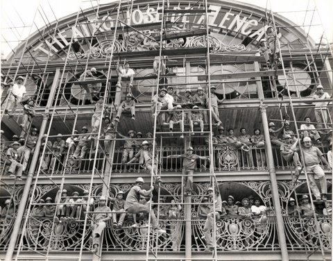 A construção localizada na parte posterior é formada pela sala de espetáculos propriamente, dita. Trata-se de uma construção que concilia a utilização da alvenaria (paredes laterais, posterior e teto), com a estrutura de ferro decorado, formando as frisas, camarotes e varandas externas, bem como a fachada principal.