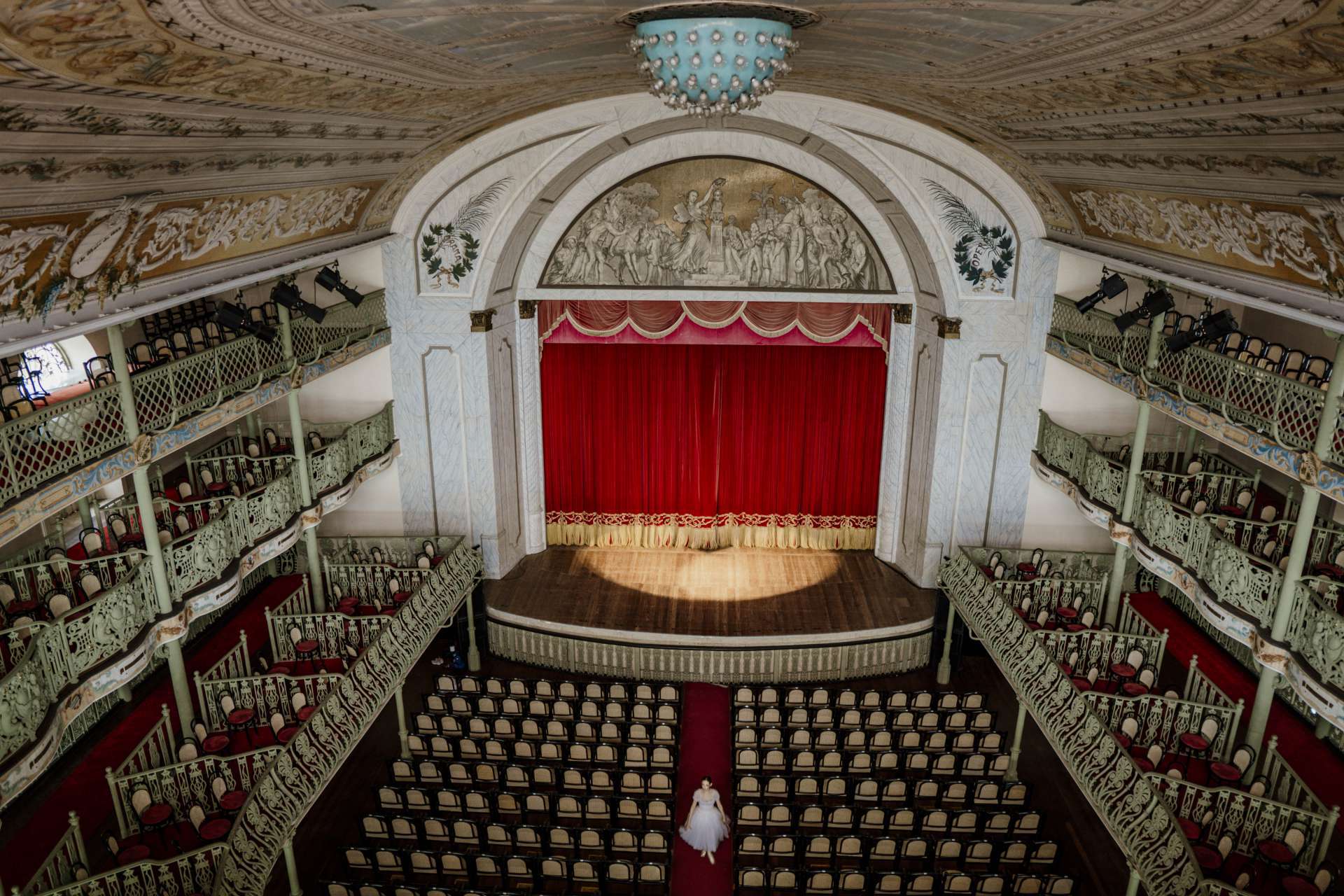 No segundo pavimento, a fachada é formada por uma varanda com gradil em formas circulares. O terceiro pavimento possui gradil em forma retangular. Acima deste último andar há gradil em forma circular, vedado por vidro. A construção comunica-se com o "foyer", através de passarelas dispostas no terceiro andar. Na parte interna, temos a platéia disposta no andar térreo, e nos andares superiores temos as frisas e camarotes divididos por gradis em ferro decorado. As cadeiras da platéia são em "palhinha".