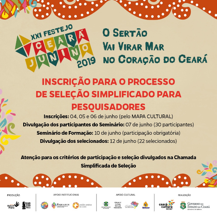 Dando seguimento e fortalecendo o caminho da Pesquisa nos editais dos ciclos da cultura popular, o XXI Ceará Junino terá uma Comissão de Pesquisadores acompanhando as 21 etapas regionais e o concurso Estadual (campeonato).