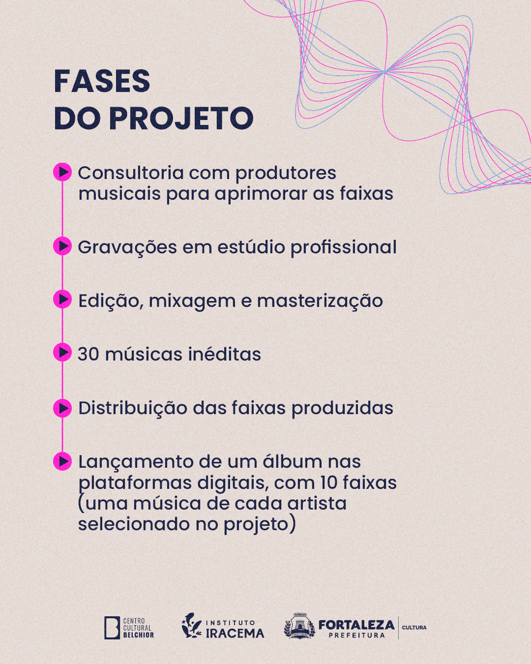 A iniciativa tem como objetivo fortalecer a cena musical da cidade por meio da produção e da difusão de faixas inéditas, além de promover o desenvolvimento profissional de artistas e bandas da cidade. Por meio de convocatória pública, serão selecionados 10 projetos artísticos (individuais ou coletivos) que irão produzir três faixas cada.